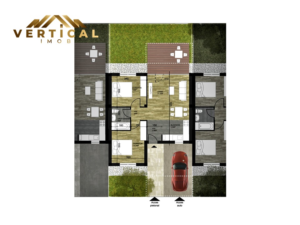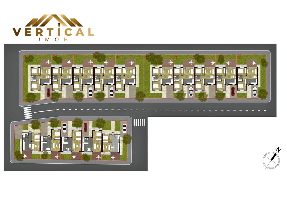 Compartimentarea fiecarui imobil separat va fi urmatoarea: 1 sau 2 dormitoare, 1 living, 1 grup sanitar cu cada, 1 bucatarie, 1 hol la intrare, 1 terasa + bonus: pod inalt mansardabil pe toata suprafata casei cu podea placa de beton peste parter.
