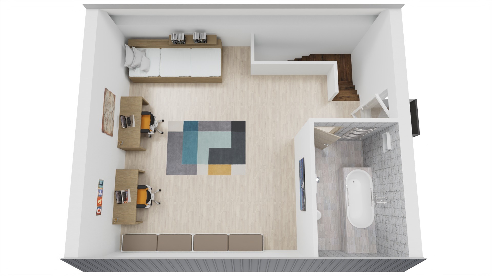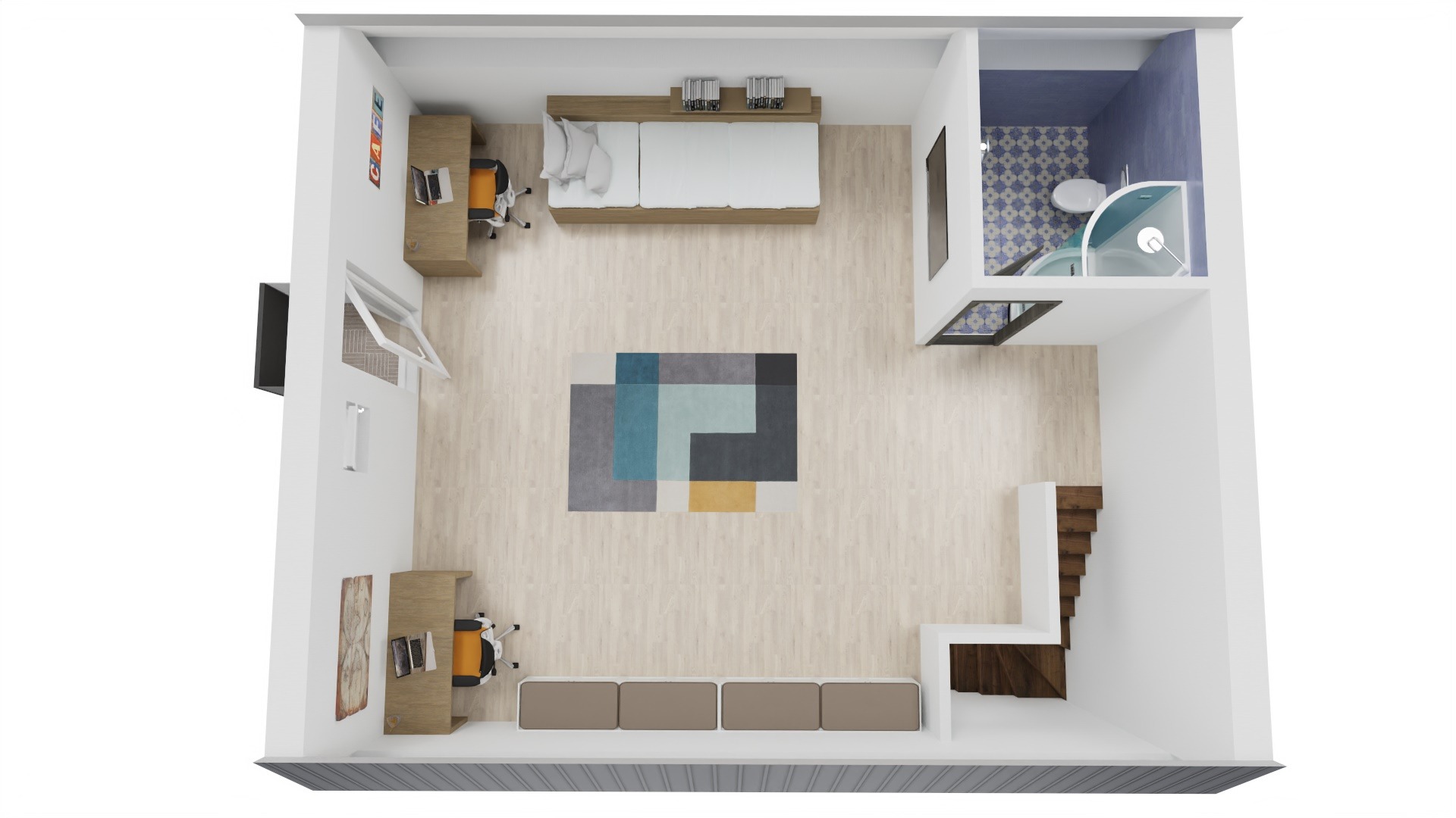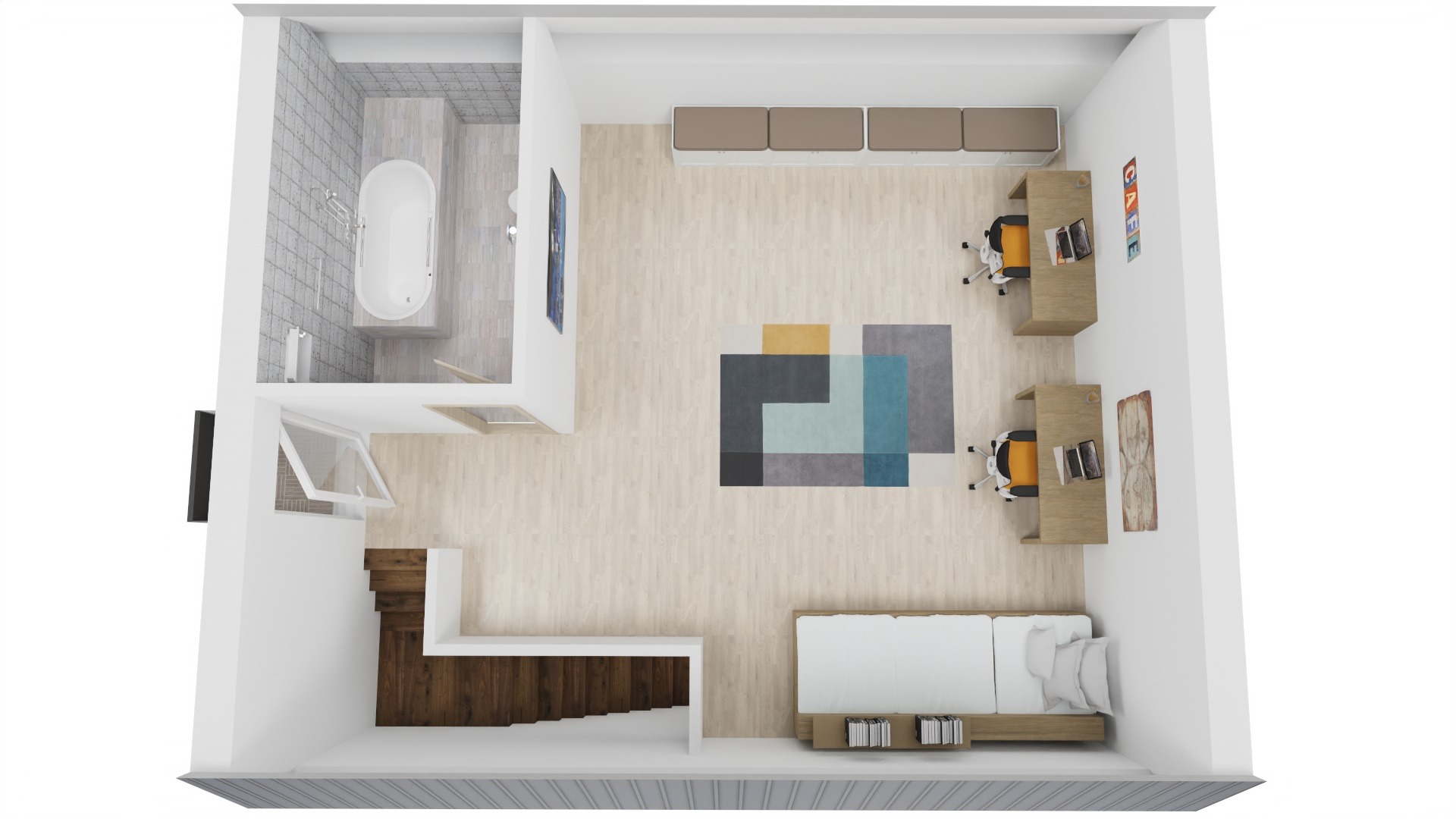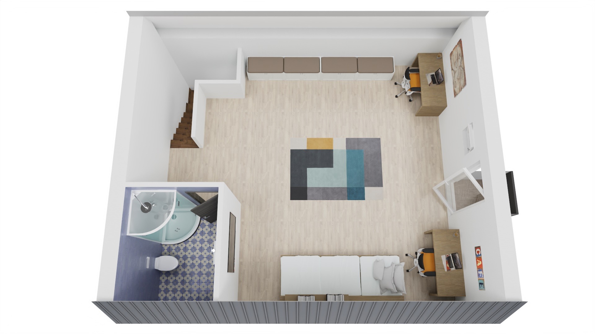 Etaj: open space elegant si deosebit cca 36mp (GRATUIT poate fi compartimentat la cerere in 2 dormitoare inalt de cca 3.10m, baie 4,65mp-6.50mp.