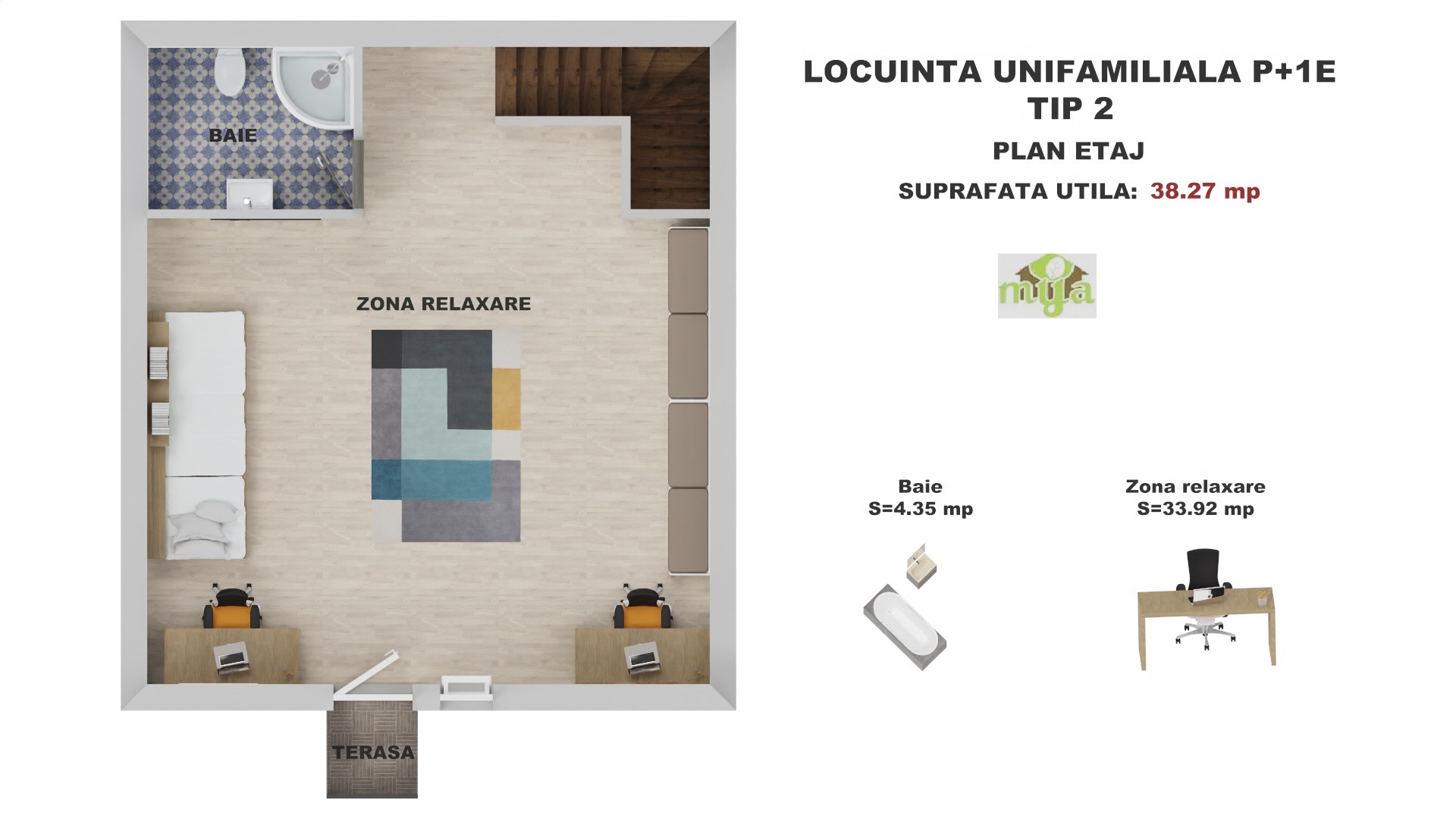 Parter: bucatarie + living 26,50mp, dormitor 12mp, baie 3.70mp, hol 2,20mp, casa scarii 5.50mp.