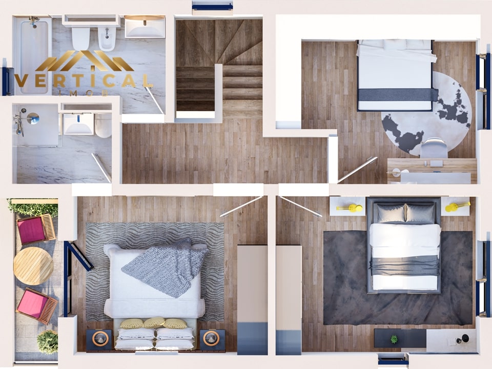Imobilul este compartimentat astfel: 3 dormitoare elegante, 1 living spatios, 1 bucatarie semideschisa, 3 bai, o terasa, un balcon.